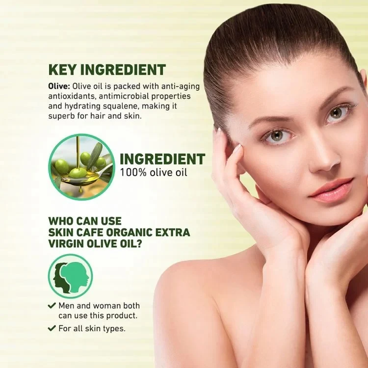 Skin Cafe 100% Natural Extra Virgin Olive Oil, extracted in a cold-pressed way, is 100% pure and essential considering hair, skin, and beauty application. Anyone concerned about the natural regrowth of hair can use this oil as it helps regrow hair. This oil is always preferred to stop hair loss, diminish dandruff, make hair smooth and moisturize a new layer of skin.