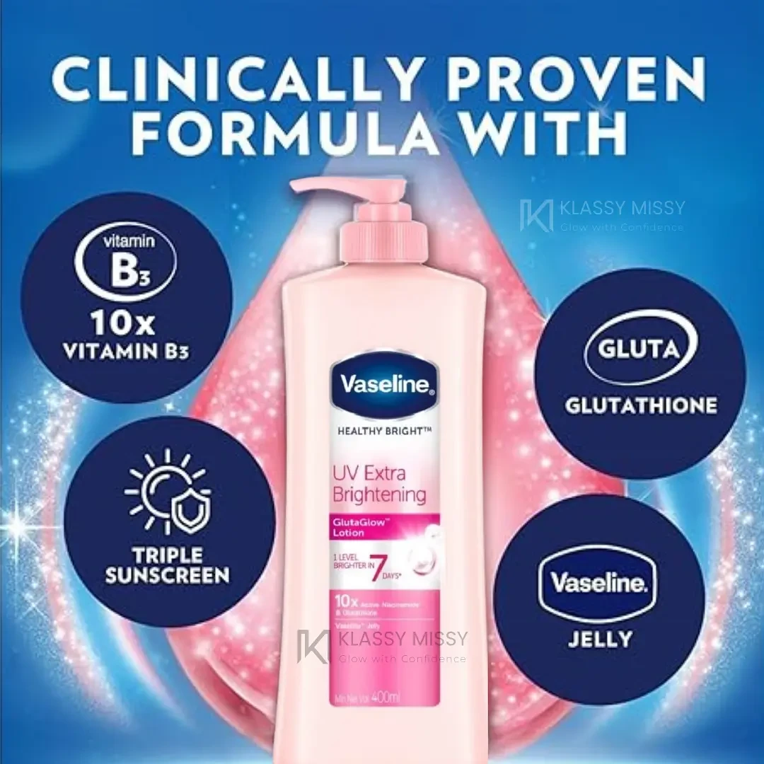 Get visibly brighter, healthier, and glowing skin with Vaseline Healthy Bright UV Extra Brightening Gluta Glow Lotion.