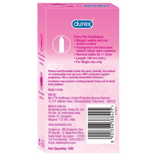 Enjoy intimacy with a playful twist using Durex Extra Thin Bubblegum Flavoured Condoms. Designed to provide ultra-thin sensitivity for a natural, skin-to-skin feel, these condoms also come with a sweet bubblegum flavour to add fun and excitement to your intimate moments.