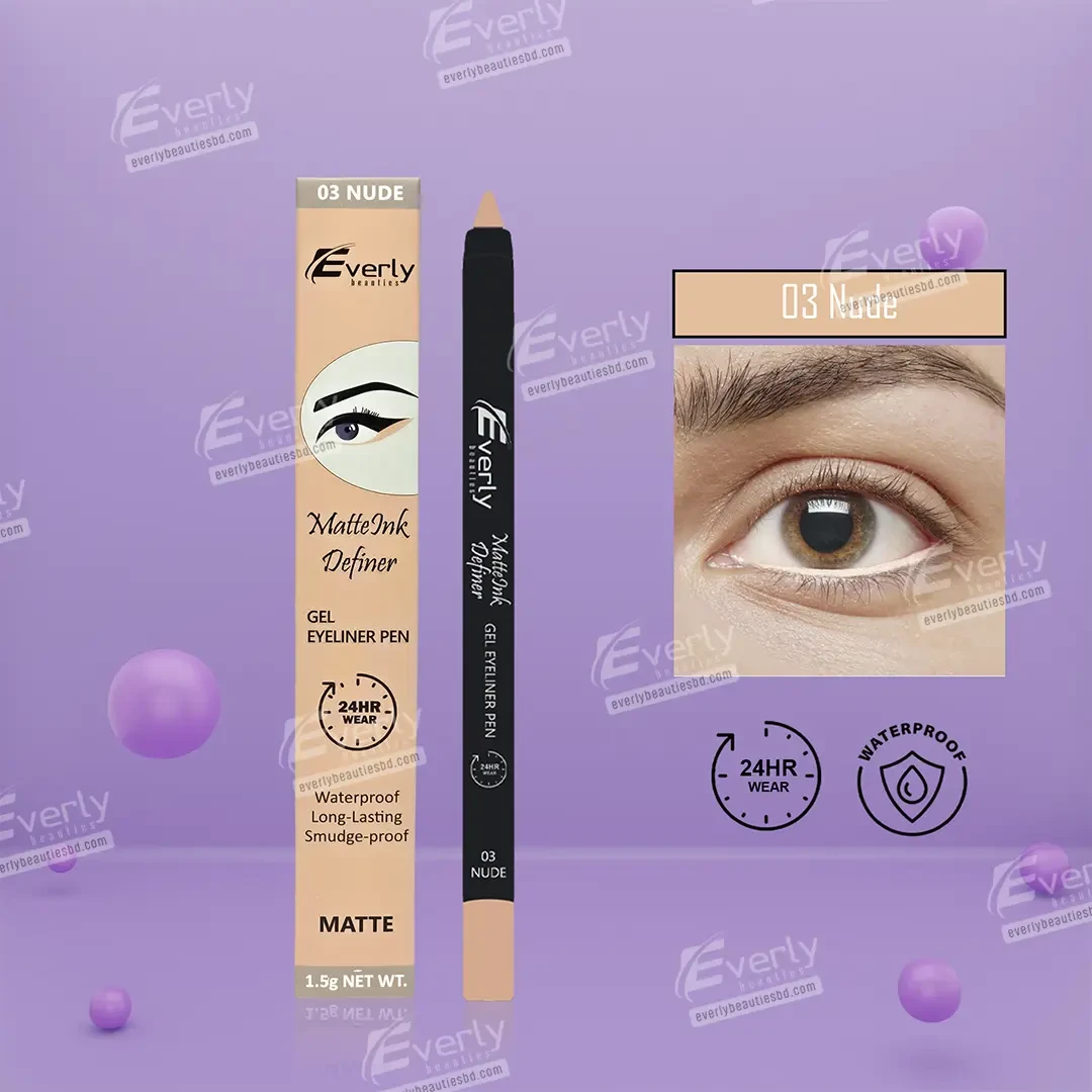 Define your eyes with the Everly Beauties Matte Ink Definer Gel Eyeliner Pen Kajal in Nude, your go-to for creating stunning eye makeup looks. This gel eyeliner pen features a smooth, creamy formula that glides effortlessly onto the eyelids, delivering intense pigmentation and a matte finish. The nude shade enhances and brightens the eyes, making it perfect for both everyday wear and special occasions.
