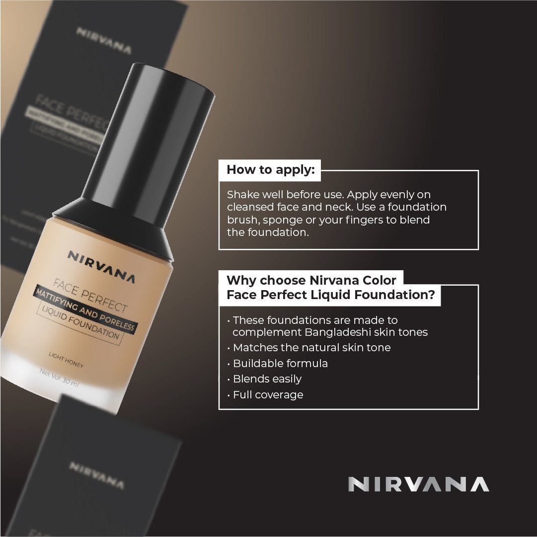 Nirvana Color features four new full coverage yet buildable foundations that give a flawless, long-lasting finish, cover up blemishes, and conceal imperfections and dark circles. These foundations are made to complement Bangladeshi skin tones.